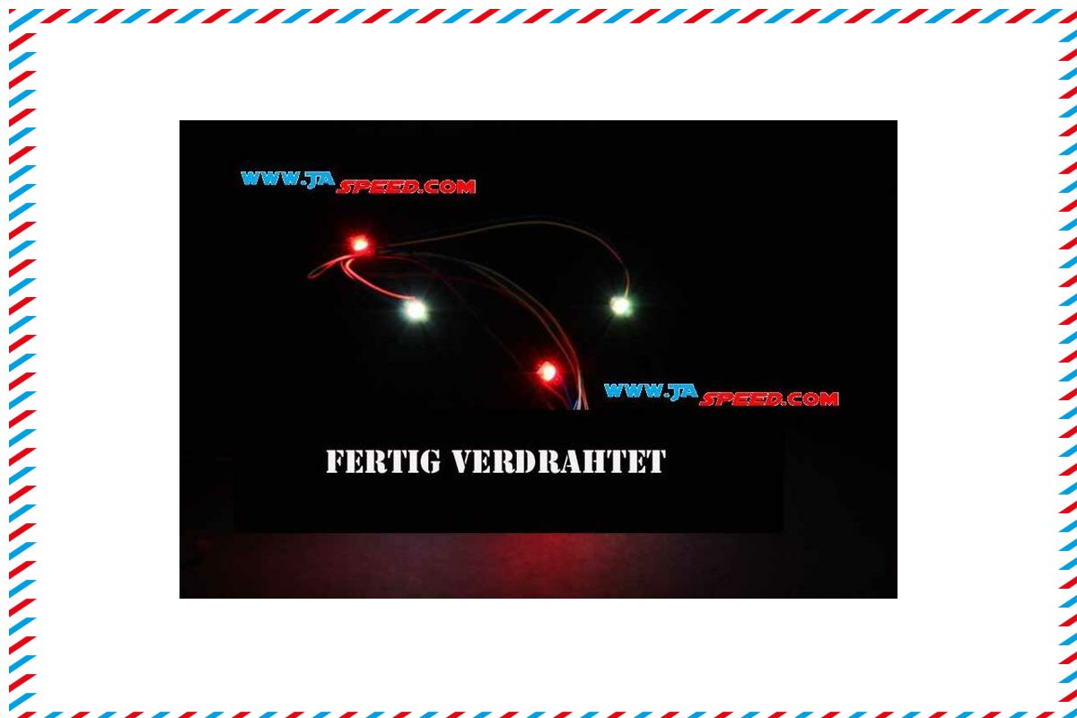 Beleuchtungssatz XENON easy ultimate SMD bis 20 V DC REV. B Fahrzeug-Beleuchtung für Slotcars 1:32 / 1:24 Ultraleichtes High-Tech-Lichtsystem auf SMD Basis ,2 x weiß ultrahell vorne, 2x hellrot hinten Der Bausatz-Inhalt: komplettverlöteter und verdrahteter Beleuchtungsbausatz für 1:32 und 1:24er Digital slotcars, Verpolungssicher Technische Daten: 0,6 Gramm Betriebsspannung: 8 - 25 V DC  EG-Richtlinienkonformität ( CE-Kennzeichnung ) Komplett fertig verlötet ! die roten Dioden ( rot / blaues Kabel) einfach an die orange weißen Kabel vom Chip anlöten die weißen Dioden (weiß / blaues Kabel) einfach an die grün gelben Kabel vom Chip anlöten. Fertig. Ultraleicht und super einfach und schnell ein zu bauen.
