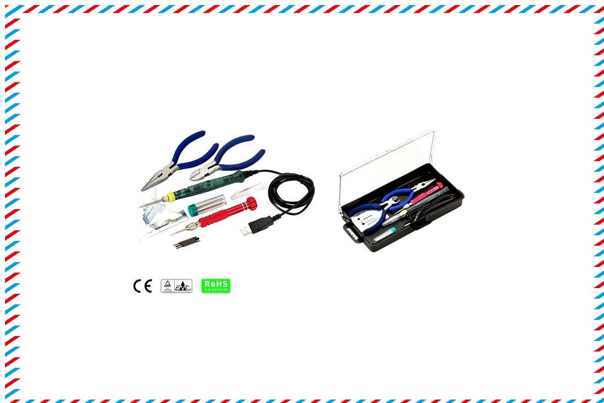 LötsetZD-972F mit USB Lötkolben 5V/8W, Schraubenzieher mit 4 austauschbaren Aufsätzen (2x Schlitz, 2x Kreuzschlitz), 2 Zangen, Lötzubehör.