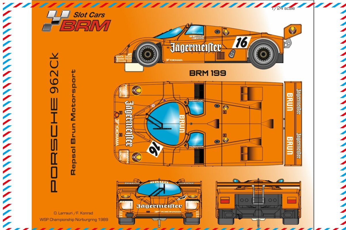 Porsche 962CK Jägermeister Nürburgring 1989 Nr.16 BRM Slotcar BRM199. You can find more BRM slot car models at: : BRM slotcars