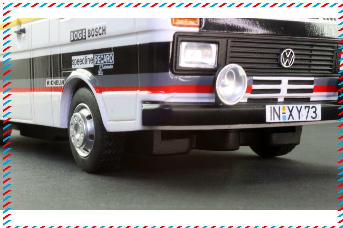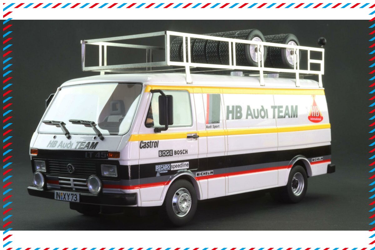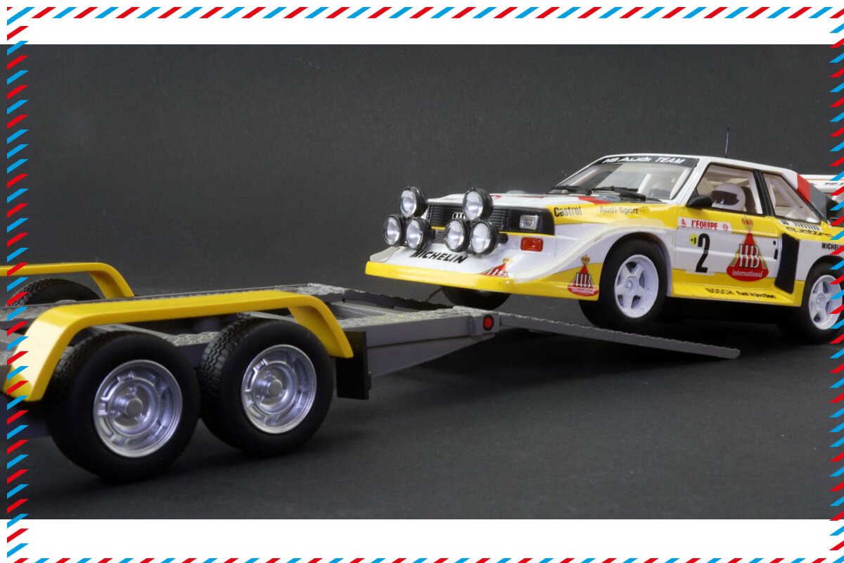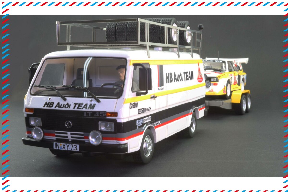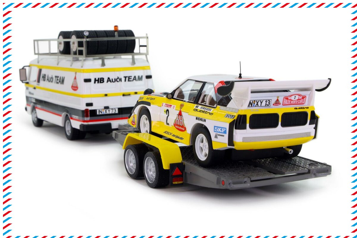 VW LT45 mit Trailer und Audi S1 Rally 400 Rally HB Nr.2 Premium collection . Wunderschön detailliertes Avant slot Slotcar Modell in 1/32 für analoge Autorennbahnen.